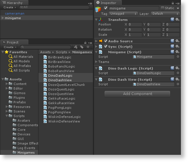 After running the wizard and naming your new minigame (following the all lower-case, underscore naming convention), a new scene will be created in Assets/Scenes/Minigames. Open the scene to see your newly created template minigame. As the post creation dialogue mentions, you will need to attach the generated Logic and View scripts (DinoDashLogic.cs and DinoDashView.cs respectively).